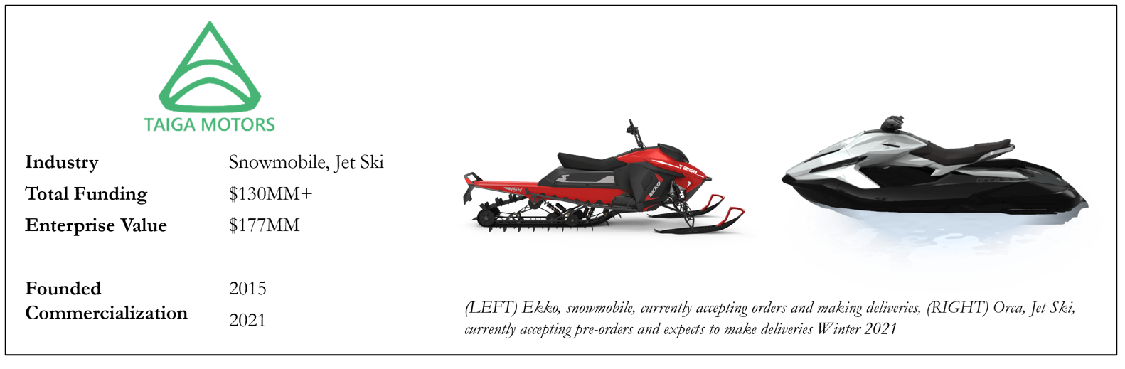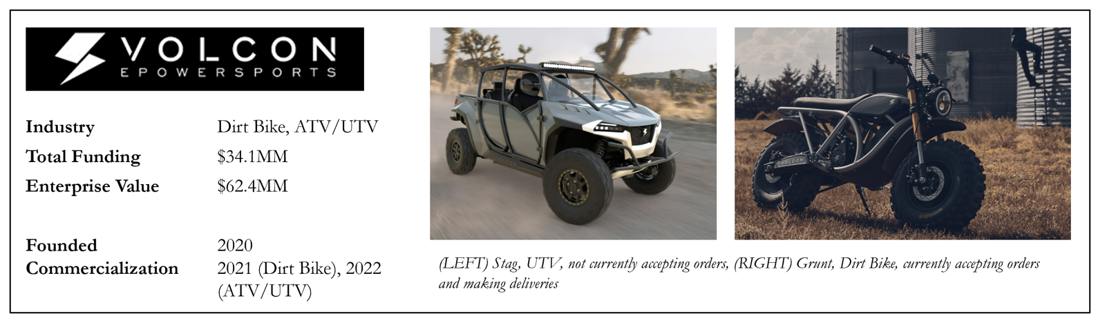 Both of these companies went public without a finished product, multi-billion dollar valuations, and without revenue. GM invested $2B in Nikola and $75MM in Lordstown to create and commercialize their electric trucks, deals that immediately fell apart for the legacy automaker.[9],[10] Beyond these two companies, Volcon E-Powersports went public in early October 2021, also without any revenue and with just one year in operating history.[11]