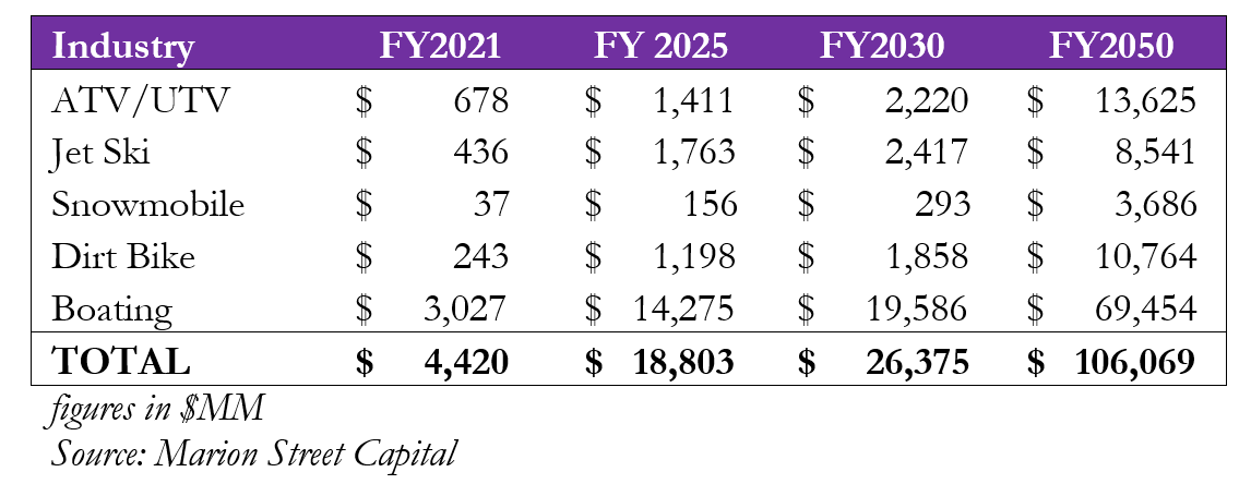 Marion Street Capital identifies five additional verticals that are currently developing and adapting electric technology with commercial potential: ATV/UTV, Jet Ski, Snowmobile, Dirt Bike, and Boating. The electric market for these industries currently represents $4.4B and may represent $18.8B by 2025.
